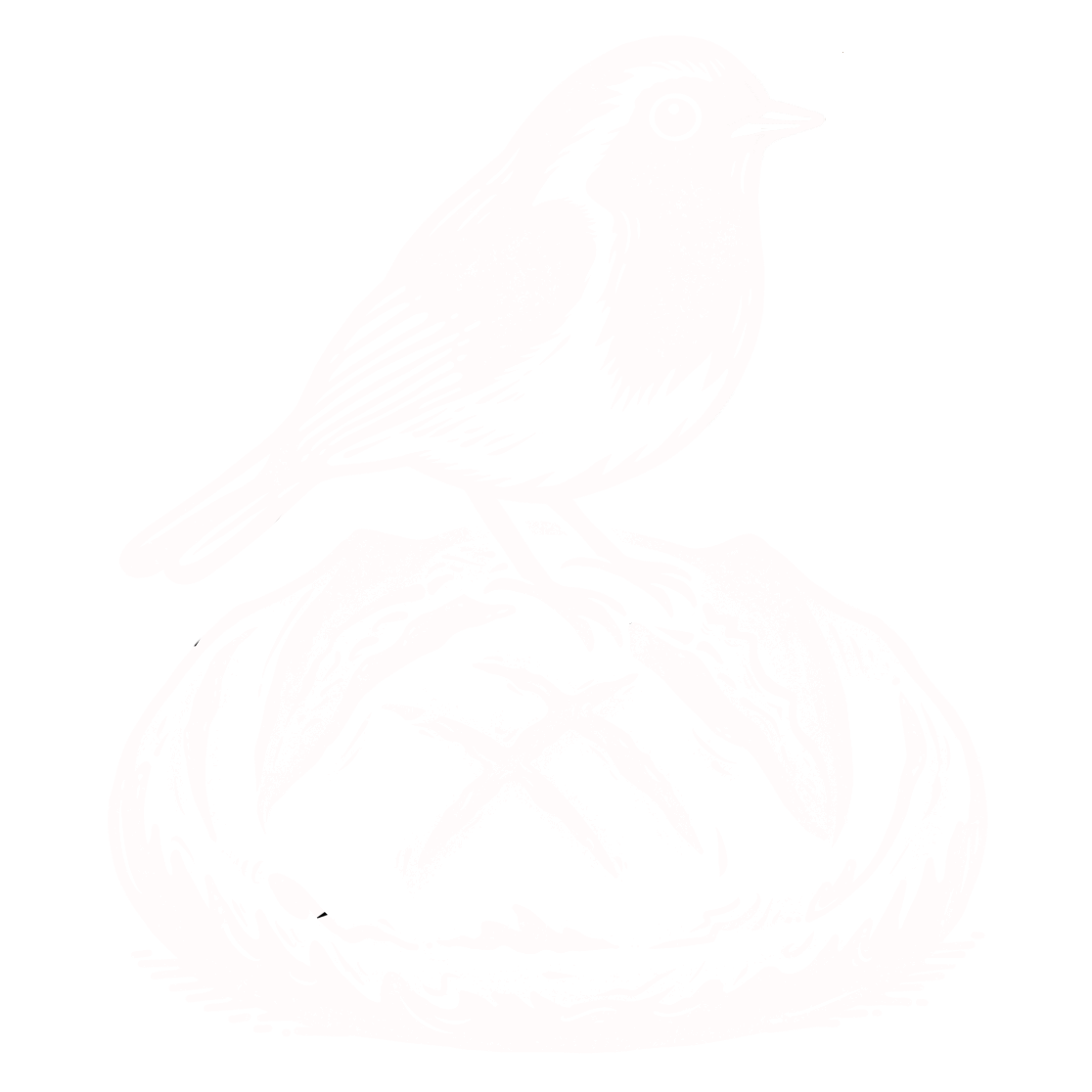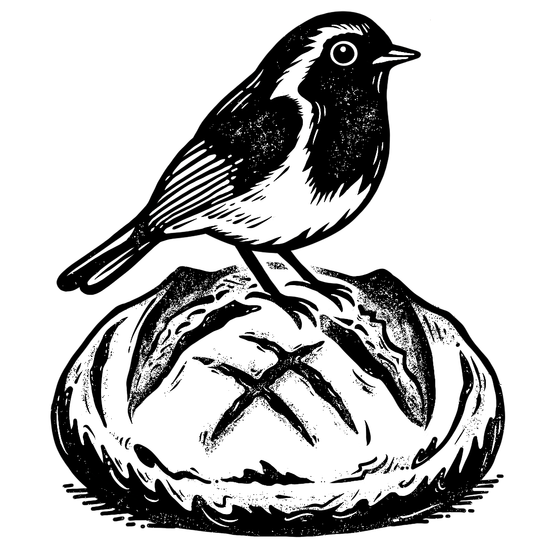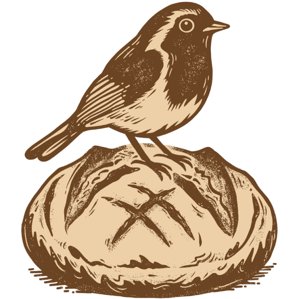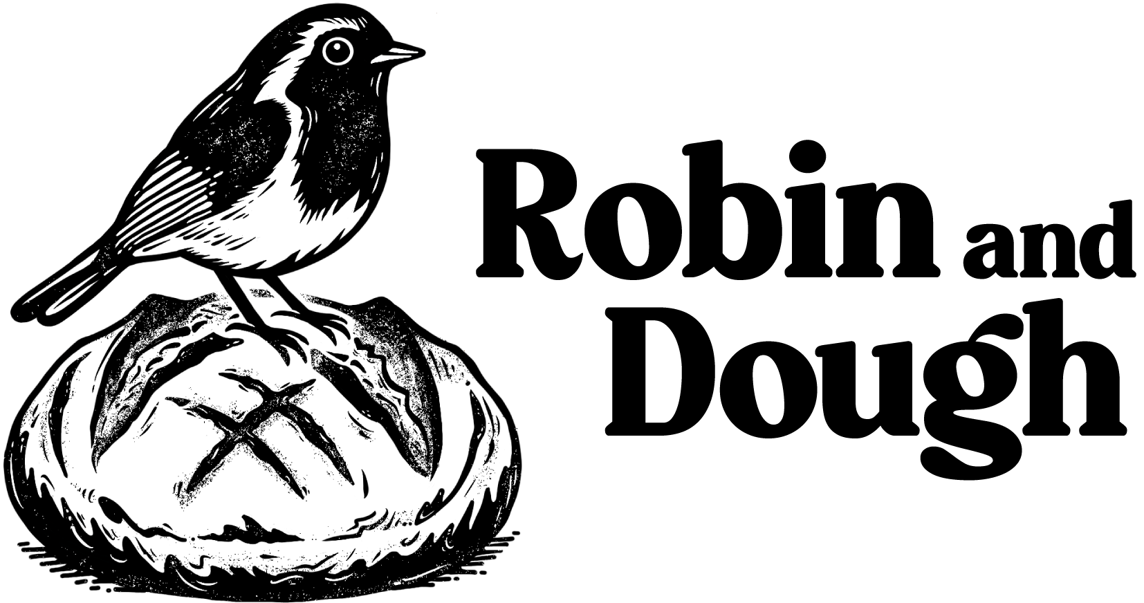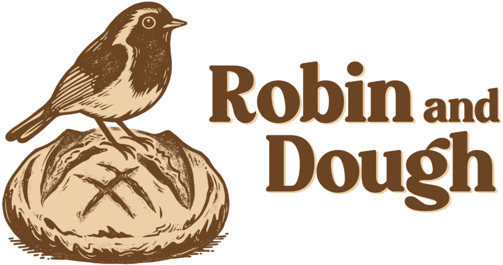 Robin and Dough is a warm, artisan-inspired brand mark featuring a detailed illustrative lockup of a robin perched atop a rustic scored sourdough loaf.